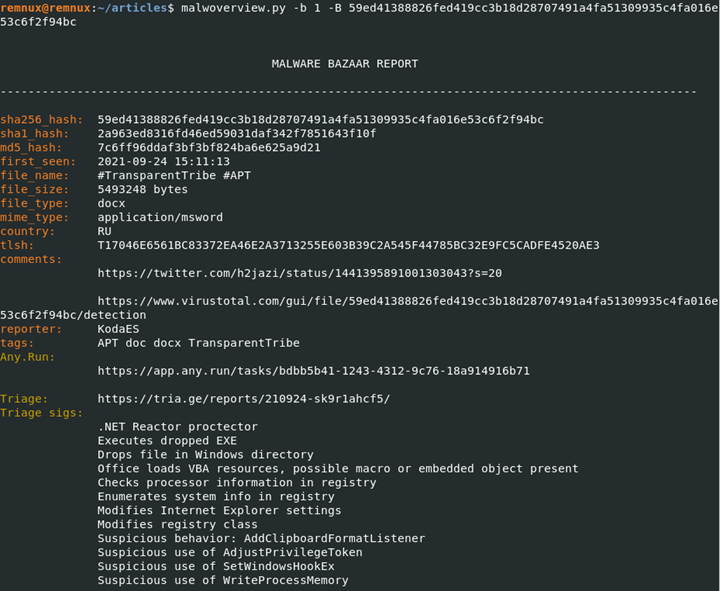 remnux@remnux:~/articles$ malwoverview.py -b 1 -B 59ed41388826fed419cc3b18d28707491a4fa51309935c4fa016e53c6f2f94bc
