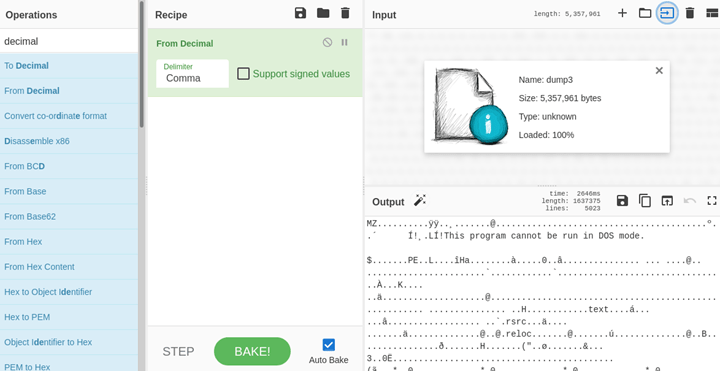 - Pick up “From Decimal” operation and configure the delimiter to “Comma”.