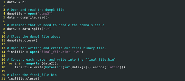 - We can write a Python 3 code to statically decode the dump3 file into a possible executable.