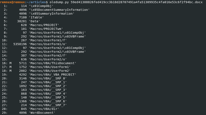 remnux@remnux:~/articles$ oledump.py 59ed41388826fed419cc3b18d28707491a4fa51309935c4fa016e53c6f2f94bc.docx -s 11 -d | more