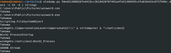 remnux@remnux:~/articles$ oledump.py 59ed41388826fed419cc3b18d28707491a4fa51309935c4fa016e53c6f2f94bc.docx -s 15 -d | strings