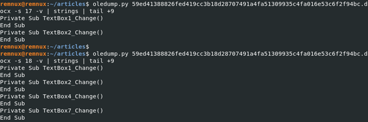remnux@remnux:~/articles$ oledump.py 59ed41388826fed419cc3b18d28707491a4fa51309935c4fa016e53c6f2f94bc.docx -s 11 -d > dump1
