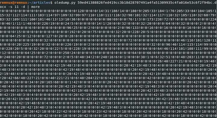 remnux@remnux:~/articles$ oledump.py 59ed41388826fed419cc3b18d28707491a4fa51309935c4fa016e53c6f2f94bc.docx -s 11 -d | more