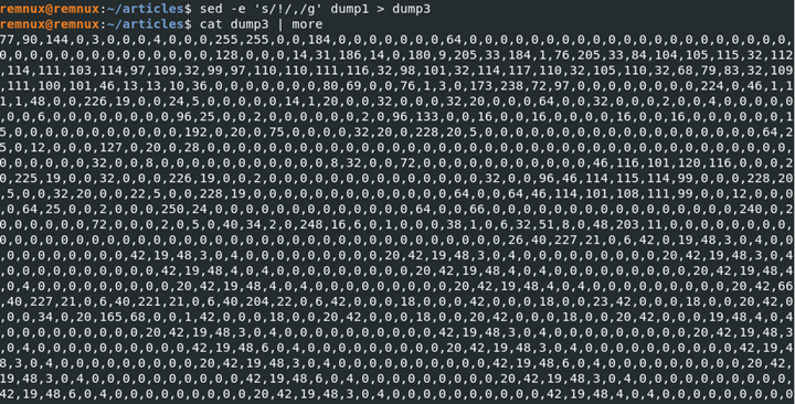remnux@remnux:~/articles$ sed -e ‘s/!/,/g’ dump1 > dump3